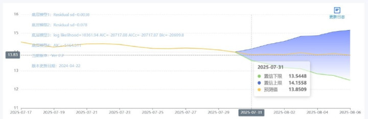 玄田算法是由项目课题组团队原创的非经典逻辑数值聚合理论和不确定性预测方法,构建了基于一致模算子的生猪价格预测模型。该模型采用的聚合函数及一致模相关理论与方法已获得多项国家自然科学基金和省级自然科学资金资助,并获得多项省级自然科学奖奖项。07月31日预测猪价为13.8509,置信区间在13.5448-14.1558之间。08月01日预测猪价为13.8721;08月02日预测猪价为13.8572。