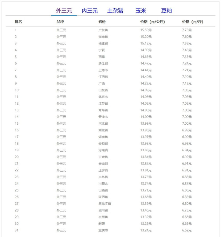 2025年07月30日-中国养猪网生猪(外三元)均价排行榜