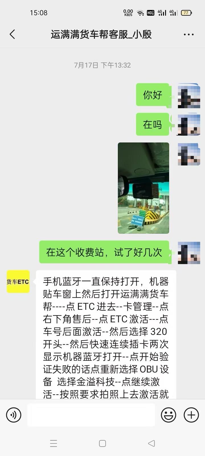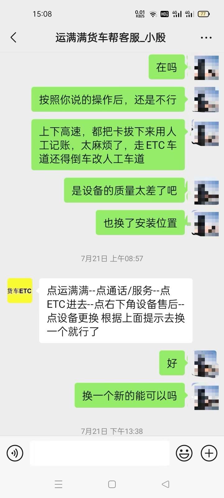 据朱先生提供的聊天记录,运满满货车帮客服曾向他表示,该ETC设备享有“3年质保”,发现问题后,朱先生与其取得联系,客服人员多次提供技术支撑,朱先生也按步骤逐一操作,一套流程过后,设备还是不能正常使用。就此,朱先生提出换货要求。