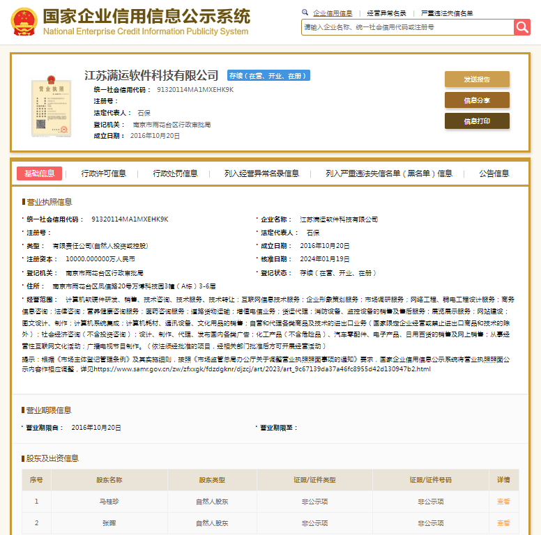 资料显示,运满满为江苏满运软件科技有限公司旗下的一站式物流平台,其通过搭建货主和司机的高效APP,实现货主高效找车、司机快速找货功能。国家企业信用信息公示系统显示,江苏满运软件科技有限公司成立于2016年,注册资本10000万元人民币,法定代表人为石保。