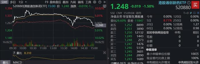场内唯一跟踪该指数的港股通创新药ETF(520880)出现罕见一幕。或受买盘资金积极进场影响,港股通创新药ETF(520880)盘中二级市场交易价格明显高于基金份额参考净值(IOPV),出现较大幅度溢价。港股通创新药ETF(520880)场内价格一度冲高涨超8%,午后多数时间仍逆行上涨,尾盘回落收跌1.5%。