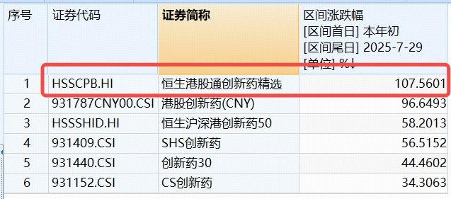 年内至昨日(7月29日)收盘,恒生港股通创新药精选指数累计上涨107.56%,领涨一众创新药指数,较恒指(27.24%)、恒科指(26.33%)分别超额80.32和81.23个百分点,超额表现突出。